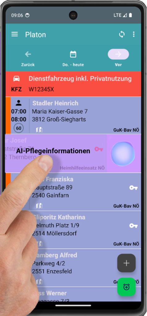 Ein sanfter Ton, ein kurzer Blick und mein Tag liegt vor mir wie eine perfekt sortierte To-do-Liste: Uhrzeit und Adresse des ersten Einsatzes, geplante Pausen (ja, heute passt eine um 11:30 Uhr!), die genaue Reihenfolge der Kund*innen, mit realistischen Wegzeiten und sogar dem Hinweis, ob ich besser mit dem Auto oder mit der Straßenbahn fahre. Ich spüre, wie der morgendliche Stress von mir abfällt. Keine Rückfragen in der Station, kein hektisches Blättern in der Dokumentation. Stattdessen ein klarer Kopf für das, was wirklich zählt: die Zeit bei den Menschen.